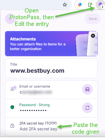Just as the secret key works in the option above, there's a way to enter the secret key directly into your Proton Pass login and have that 2FA filled in each time without having to open a separate app. From the screen above, I'd copy the secret key, then I'd open up the website in Proton Pass and click on "edit" on the entry for this website.