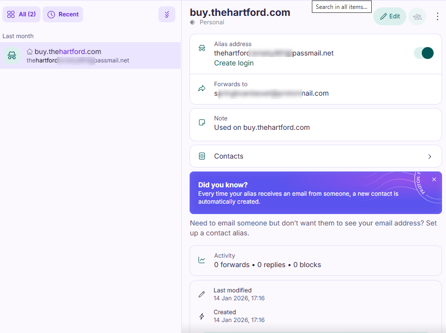 You know how you when you sign up for a newsletter or even give a company your email address and now it seems you're getting email from all sorts of random places? Aliases help fix that problem. Let me show you how I recently used this feature in real life. I recently compared insurance quotes online but really didn't want the follow-up. So, I created an email alias. Now, The Hartford doesn't have my "actual" email address, they have an address I used specifically for this one-use case.