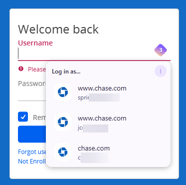 In the case that you have multiple logins for the same site, that's easy as well. For example, on this site I have three IDs stored (note the "3" in the diamond), and, by using the dropdown, I can select the one I want for this login: