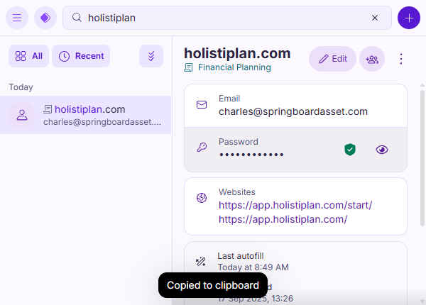 If you end up on a page that doesn't automatically let you fill in your credentials, you can click on that purple diamond on the top right of your browser and it will pull up a list of all the logins and other stored information that relates to the site you're on. You can simply click on either the username or password and it will say "copied to clipboard" then you can go back to the login screen and paste it in. For example, if for some reason my password for my tax planning software wasn't filling in, I could open up Proton Pass by clicking on that purple diamond, type in the site name in the search bar, and then click on the password and it would copy it to the clipboard where I can then paste it in to the webpage.