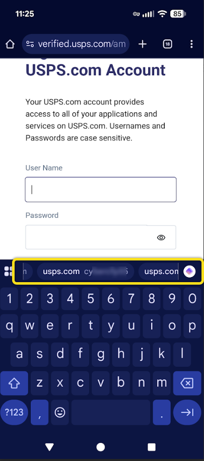 I'm on a PC 95% of the time I'd ever log in to anything, but I do have the Proton Pass app set up on my Android Pixel and Chromebook as well. And, if I wanted to log in to, say, the USPS site on my phone, then when I go to that website I get a box just above my phone's keyboard (note the yellow box below) that I can then click on the login I want and it will prefill on the page I'm visiting: