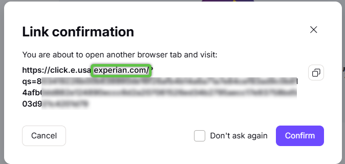 Another really nice security feature is how it handles links in emails - Proton provides a descriptive alert any time you click a link in a Proton email. As an example, I have my Proton email as my contact email for Experian, so when I got an email from them to review something, this is what came up when I clicked on that link: