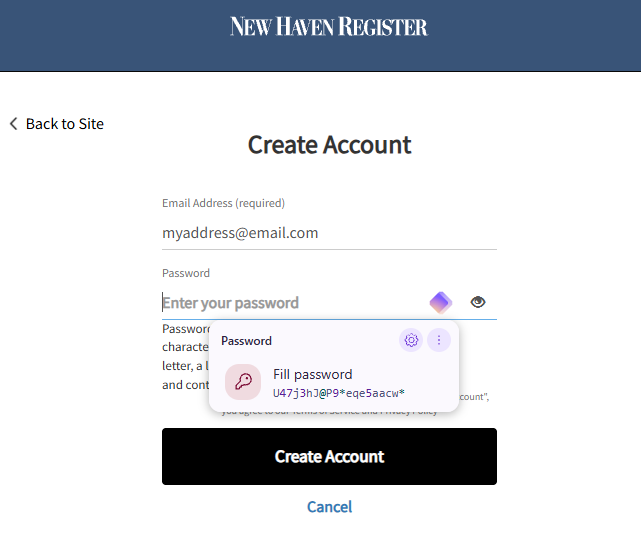 Here's the New Haven Register's site where we'll can create an account as an example. In the email address you would enter your own (I entered the "myaddress@email.com" but you would use your own or the default Proton Mail option if you choose) and when you tab down to the password line, it automatically suggests a unique gobbledygook password for the login which you can simply click on to accept it. If the website has certain restrictions on length or characters that the suggested password doesn't satisfy, just click the gear icon and make any adjustments.